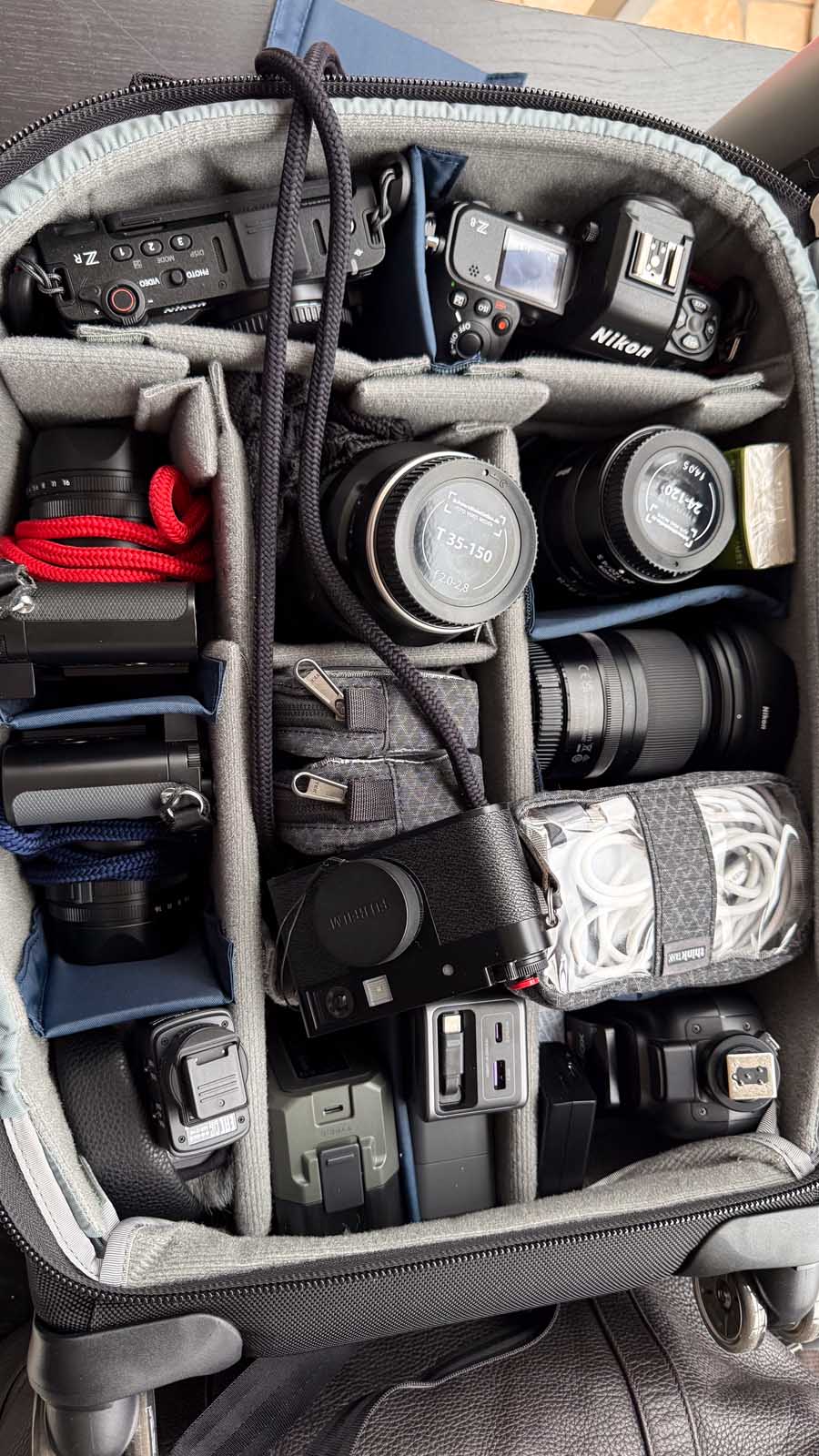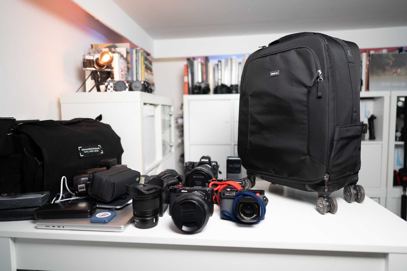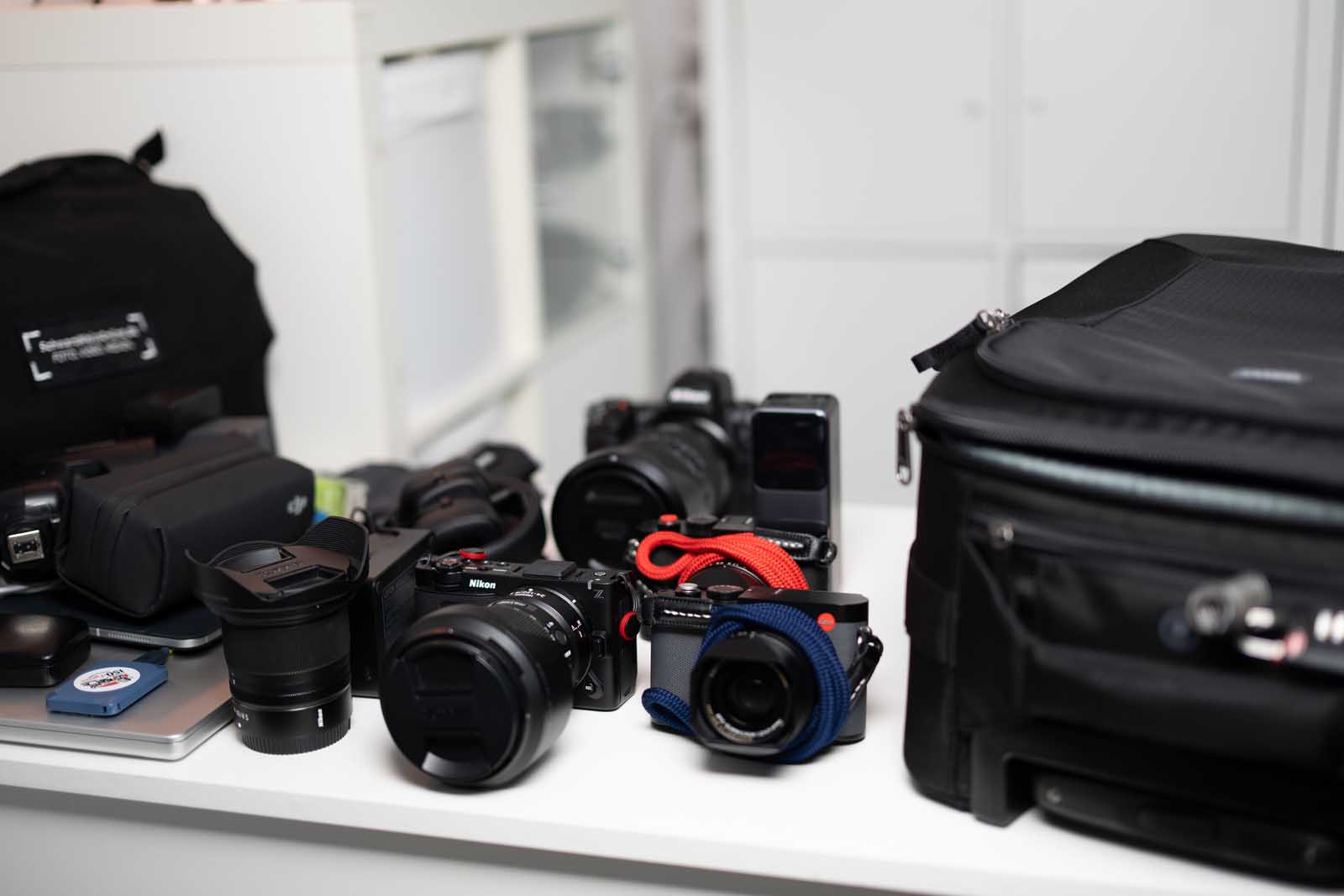 Mehrere Kamerabodys, große Zooms, Akkus, Ladegeräte, Audio-Equipment, Licht, Laptop, Tablet – und das Ganze über mehrere Tage, in Hotels, Konferenzzentren, Bahnhöfen und Eventlocations.