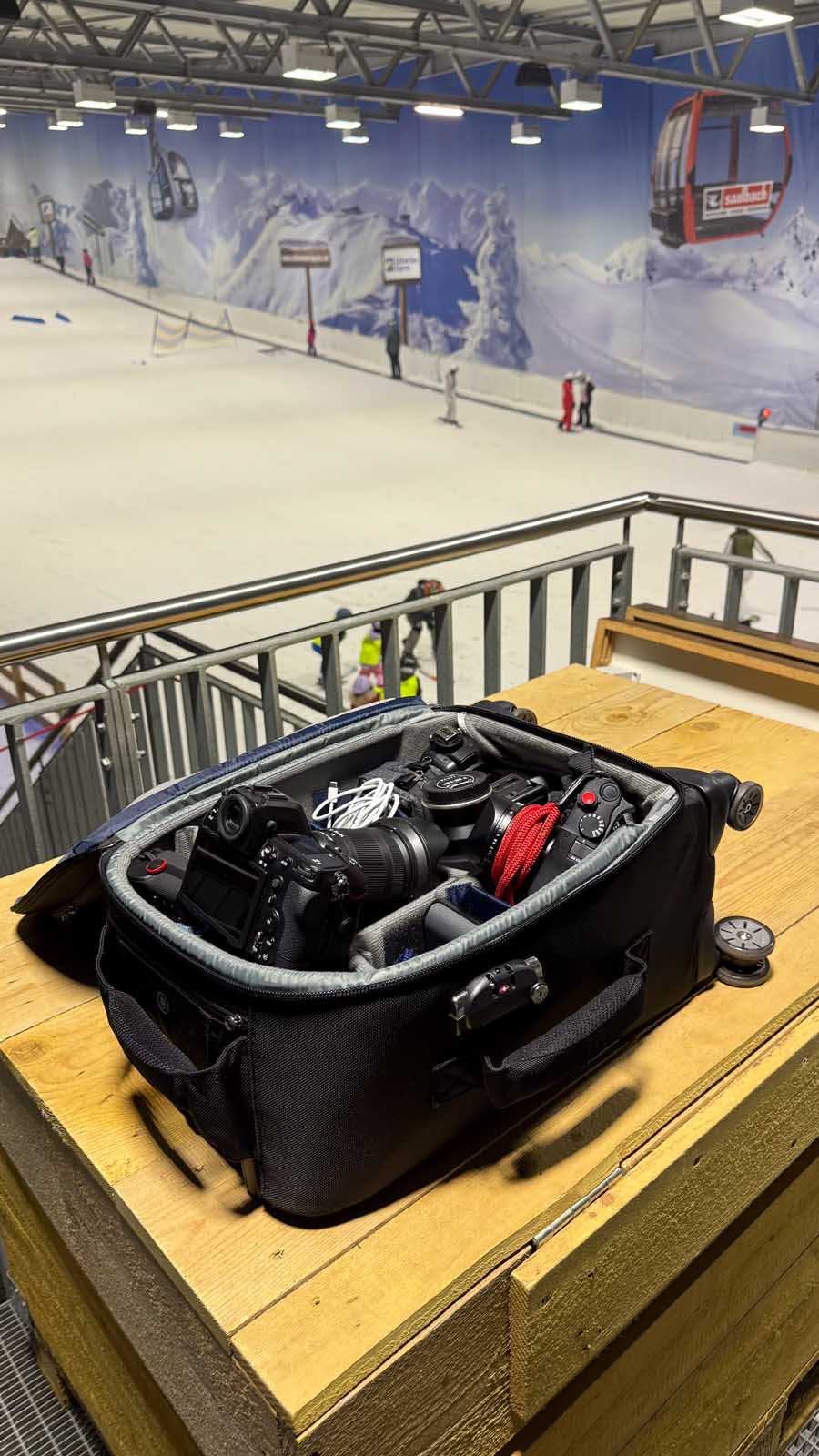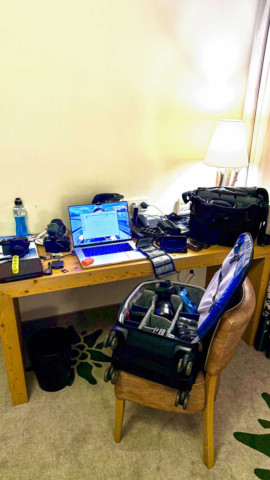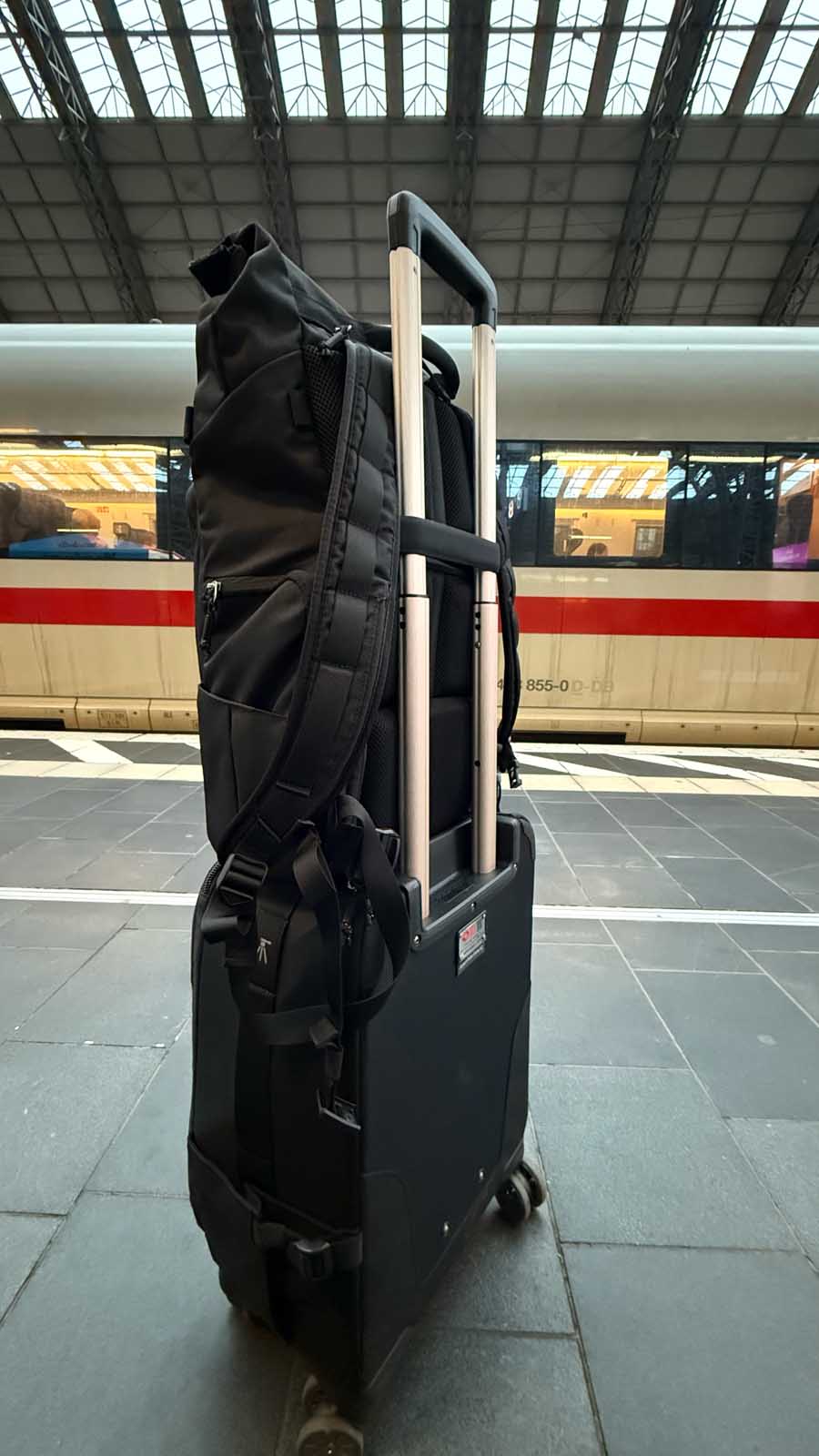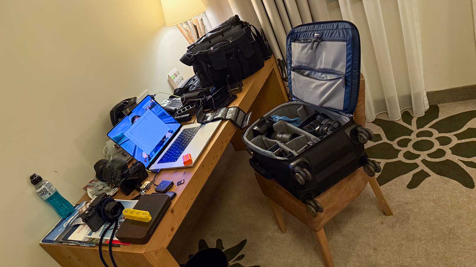 Mehrere Kamerabodys, große Zooms, Akkus, Ladegeräte, Audio-Equipment, Licht, Laptop, Tablet – und das Ganze über mehrere Tage, in Hotels, Konferenzzentren, Bahnhöfen und Eventlocations.